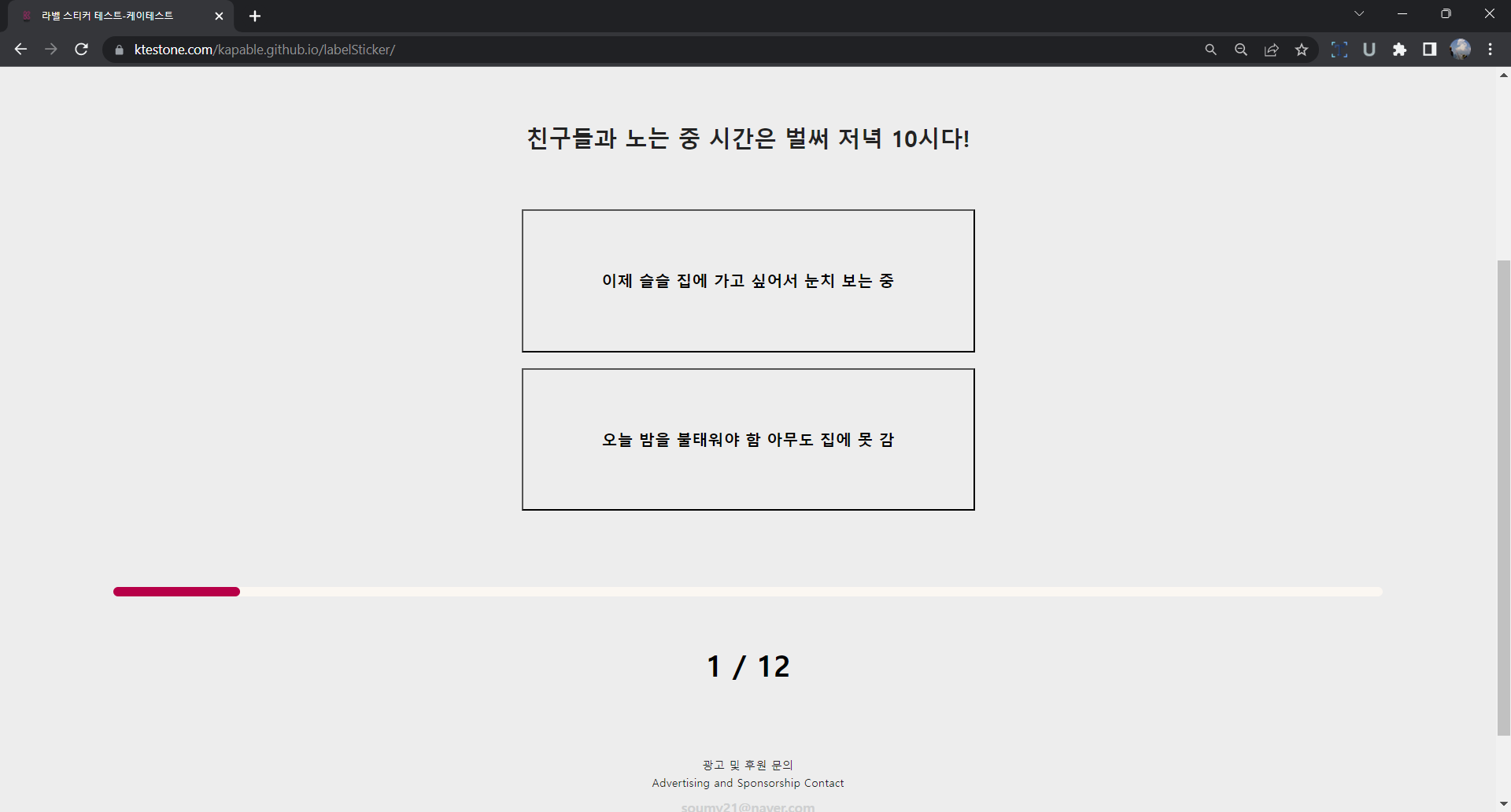 2. '테스트하러 가기'에서 시작을 하면 간단하게 2가지 답을 할 수 있는 질문이 12가지가 나오고 약 5분 정도만 시간을 내면 내 마음의 스티커를 붙여준다.
