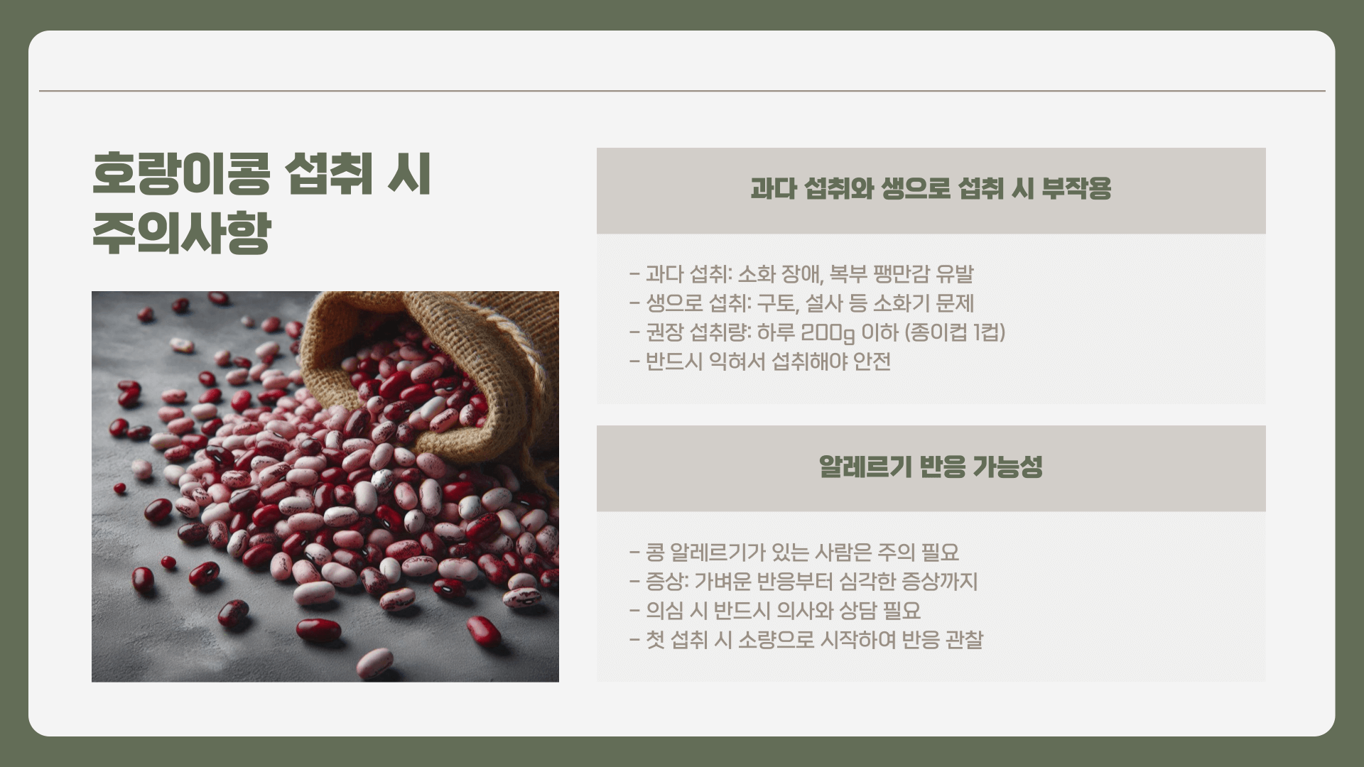 아무리 좋은 음식이라도 과유불급! 호랑이콩 역시 과다 섭취하거나 잘못된 방법으로 섭취할 경우 부작용이 나타날 수 있습니다.