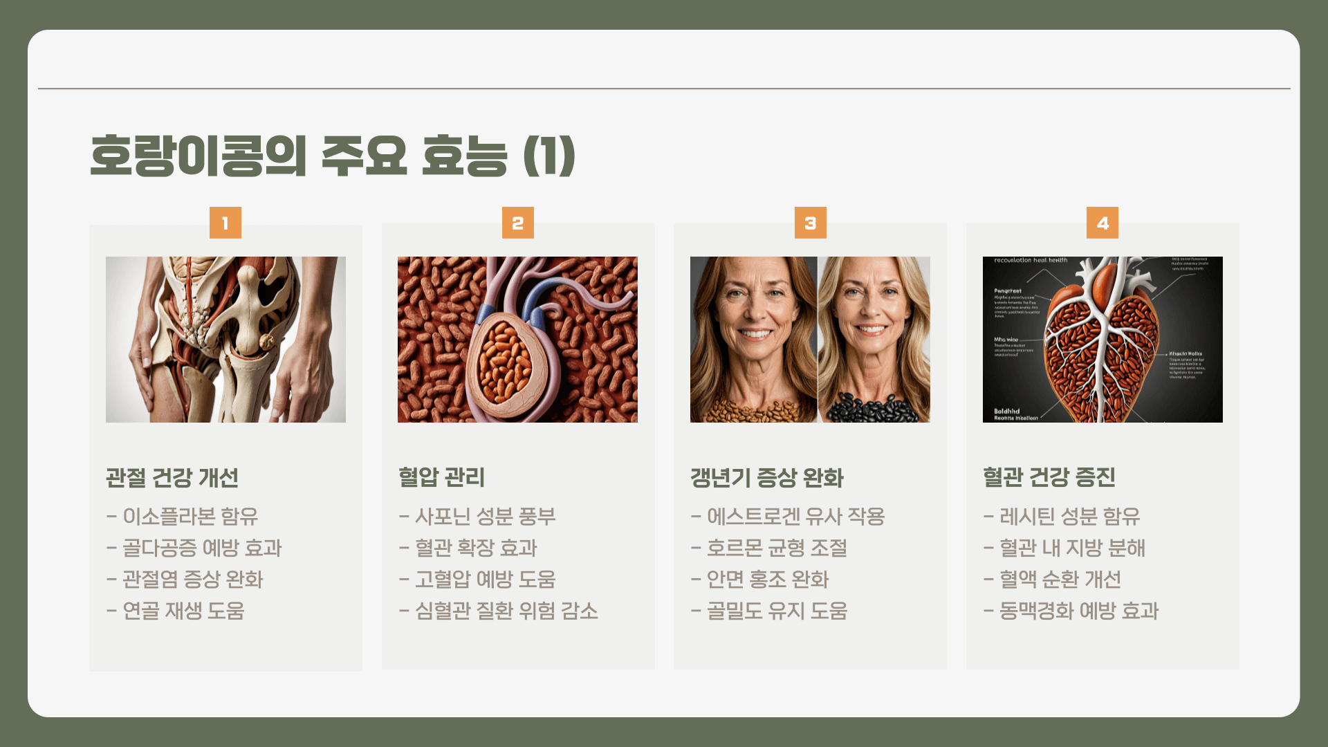 - 관절 건강: 호랑이콩에 함유된 이소플라본은 뼈와 관절 건강에 도움을 주어 골다공증 예방에 효과적입니다.