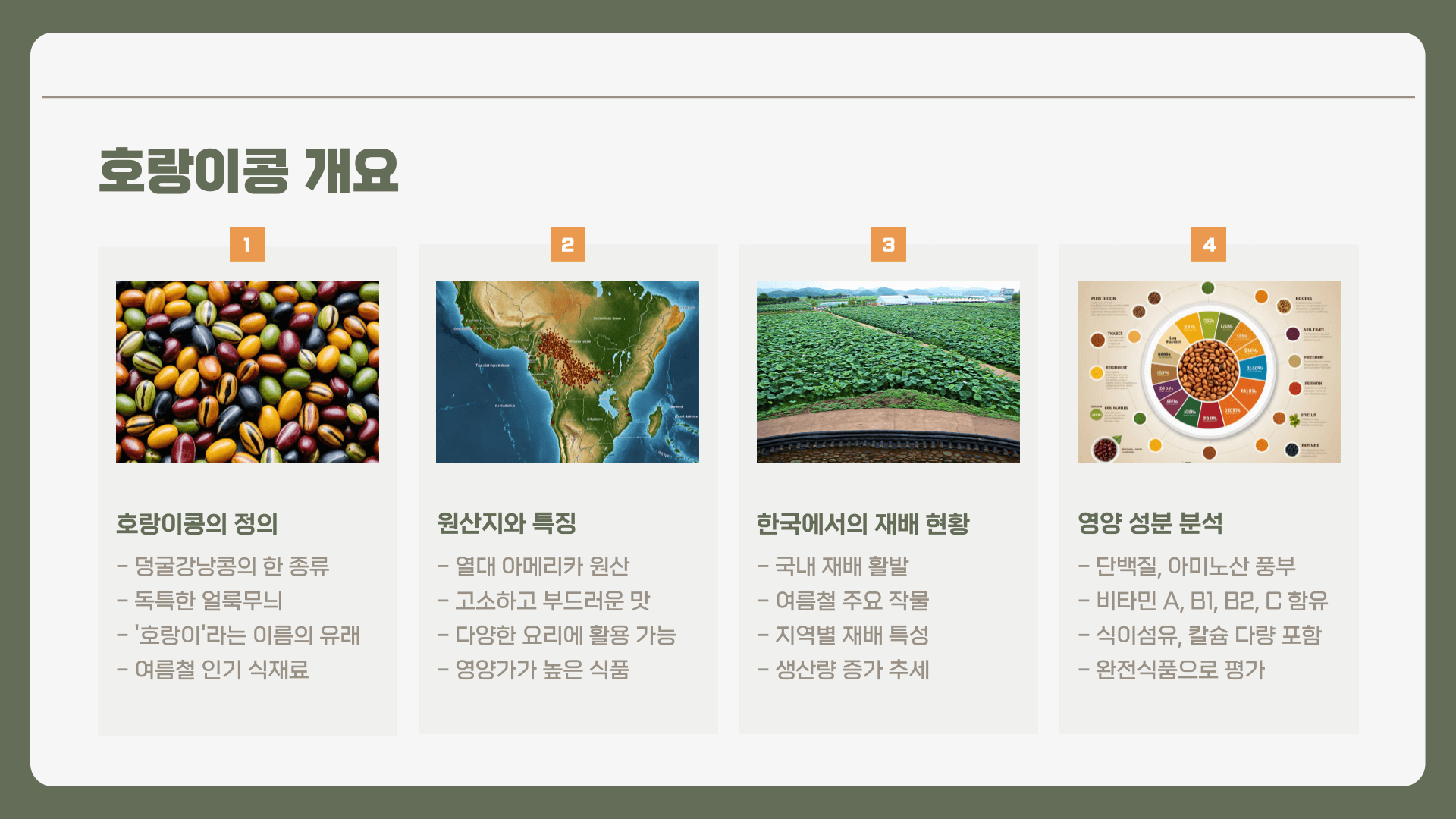 호랑이콩은 덩굴강낭콩의 한 종류로, 독특한 얼룩무늬 때문에 '호랑이'라는 이름이 붙었습니다. 열대 아메리카가 원산지이지만, 우리나라에서도 재배가 활발하게 이루어지고 있으며, 특히 여름철에 맛과 영양이 풍부해 많은 사랑을 받고 있습니다.