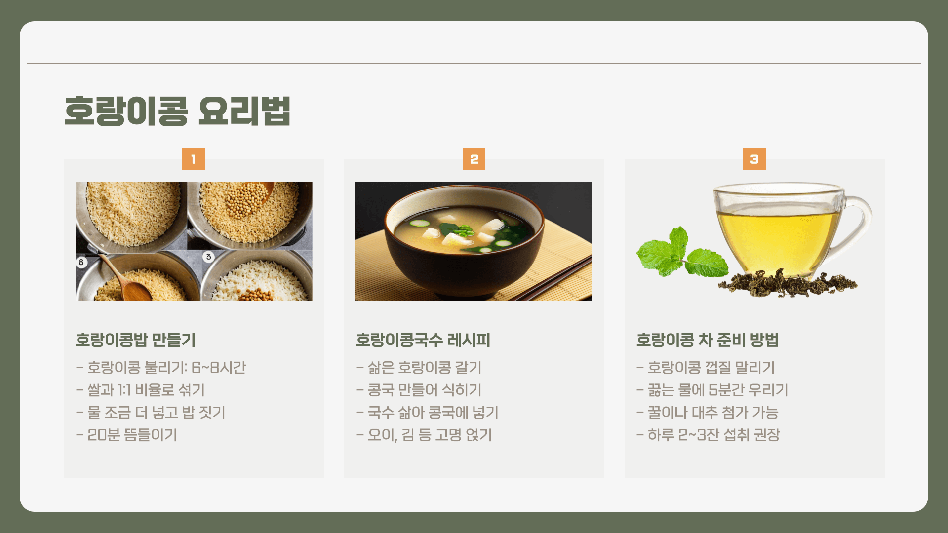 - 호랑이콩 볶음: 팬에 살짝 볶아 간식이나 반찬으로 활용하면, 고소한 맛을 더욱 진하게 느낄 수 있습니다.