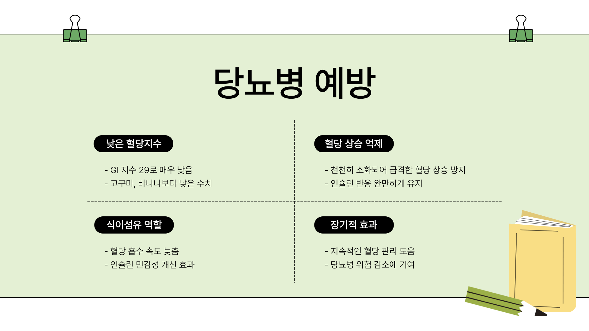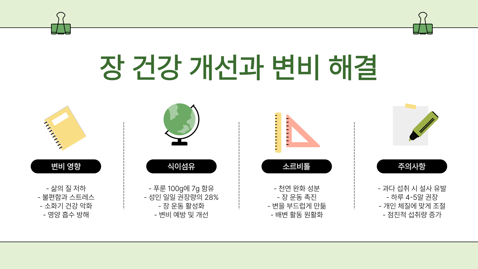 - 식이섬유: 장 운동을 활발하게 하고 변비 해소에 도움을 주며, 콜레스테롤 수치를 개선하고 혈당 조절에도 긍정적인 영향을 미칩니다.