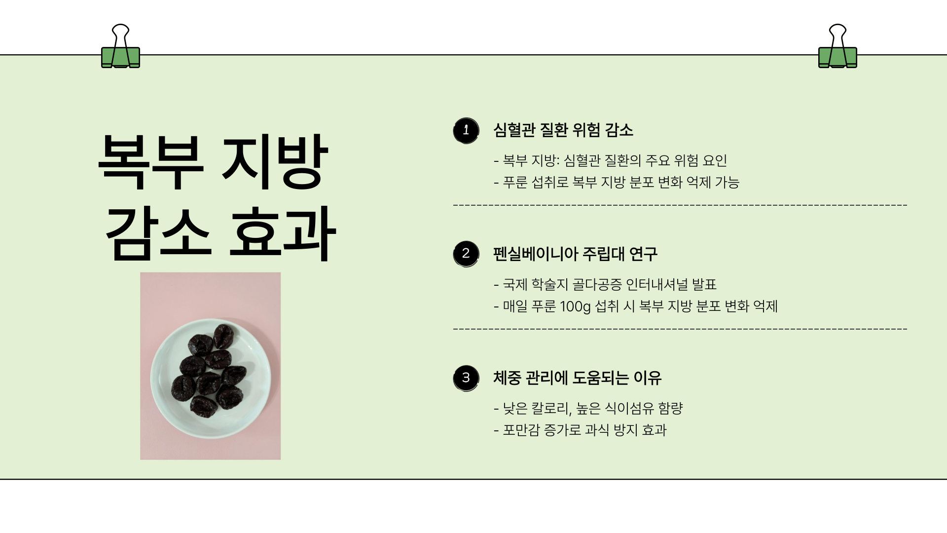 복부 지방 분포 변화 억제: 미국 펜실베이니아 주립대학교 연구진은 국제 학술지 골다공증 인터내셔널(Osteoporosis International)에 발표한 논문에서, 매일 푸룬 100g을 섭취한 참가자들이 복부 지방의 분포 변화가 억제되는 효과를 보였다고 밝혔습니다.