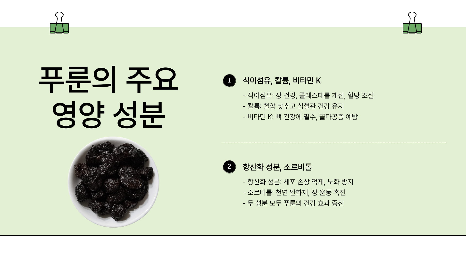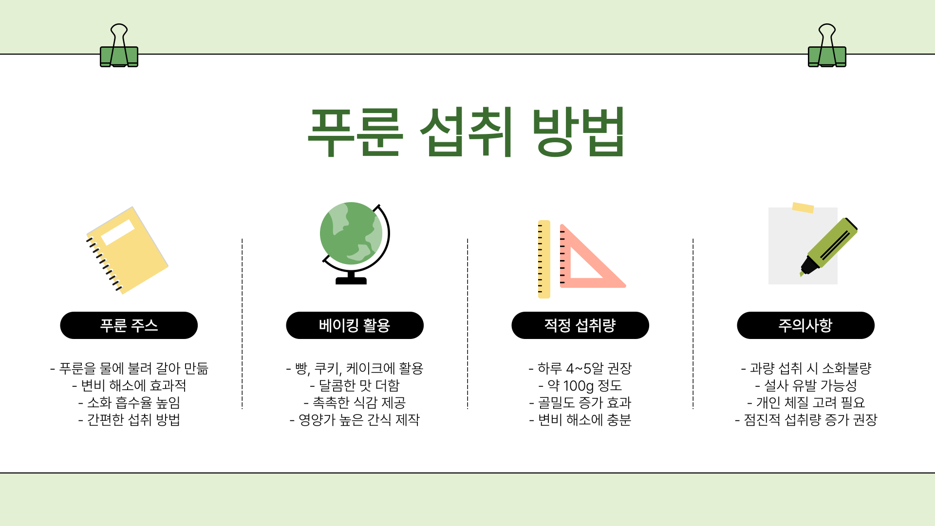 ※ 주의사항: 푸룬은 과량 섭취 시 소화불량이나 설사를 유발할 수 있으므로, 하루 4~5알 정도가 적당합니다.