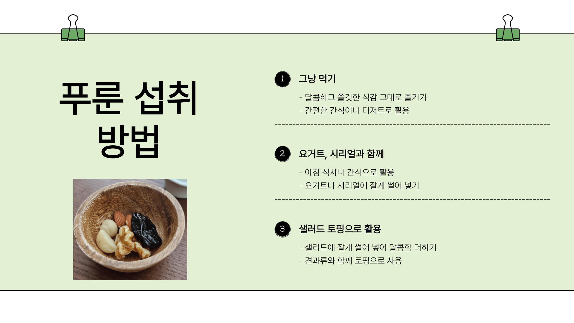 - 요거트, 시리얼, 오트밀에 곁들여 먹기: 바쁜 아침, 간편하게 요거트나 시리얼에 푸룬을 곁들여 섭취하면 든든한 한 끼 식사가 됩니다.