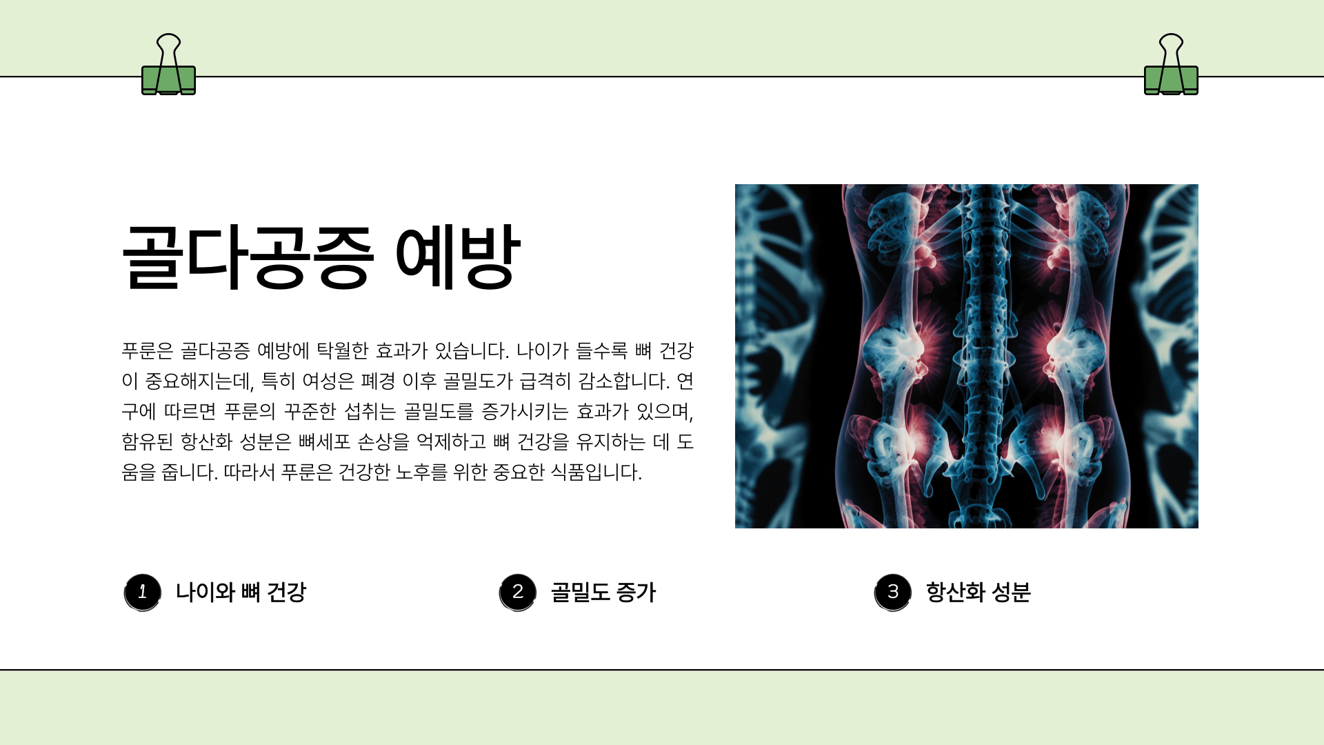 - 비타민K: 뼈 건강에 필수적인 영양소로, 골다공증 예방에 도움을 줍니다.